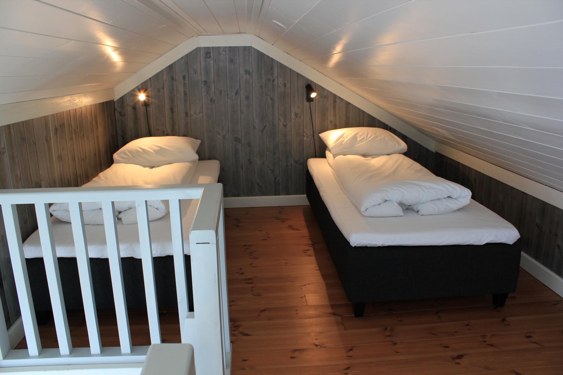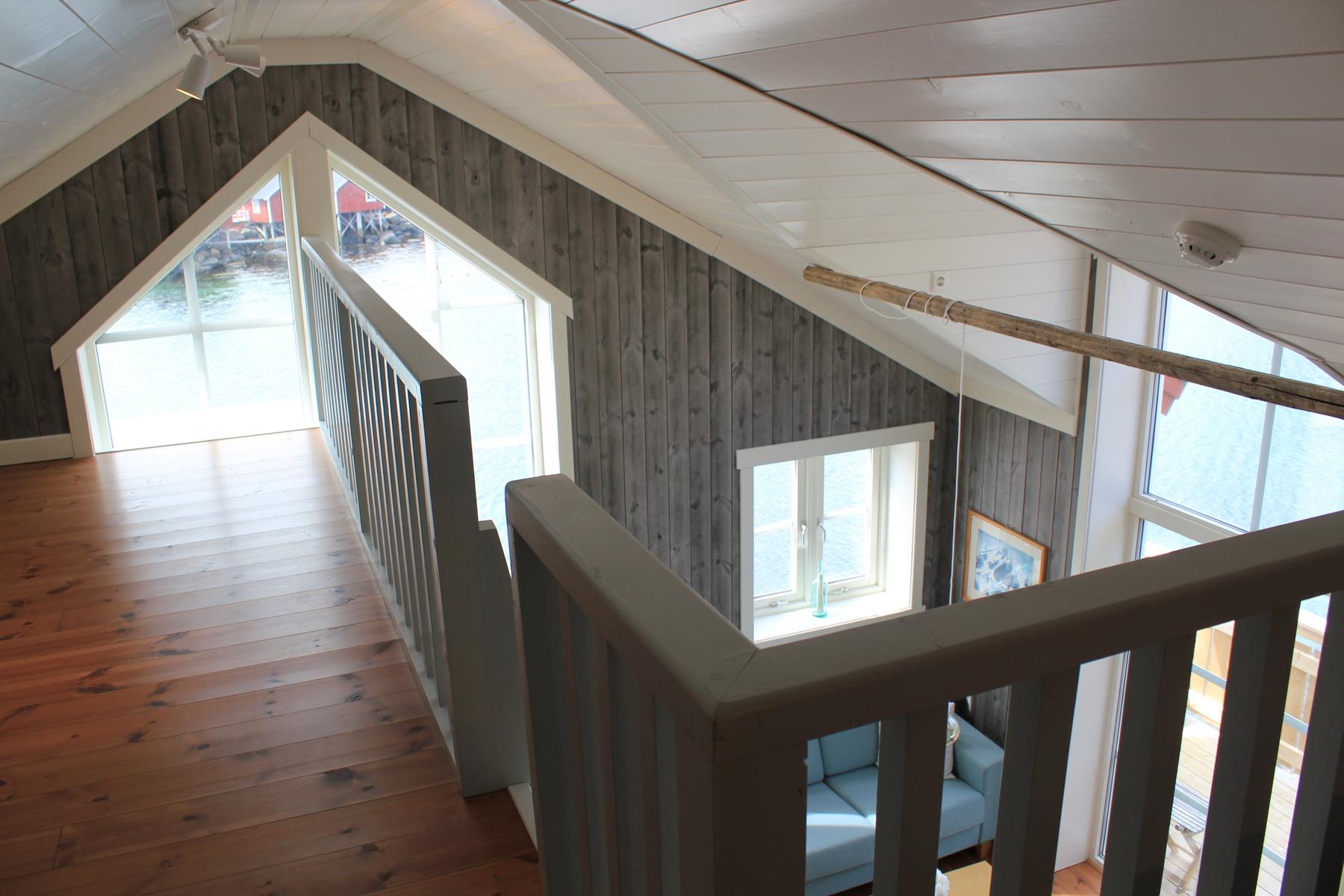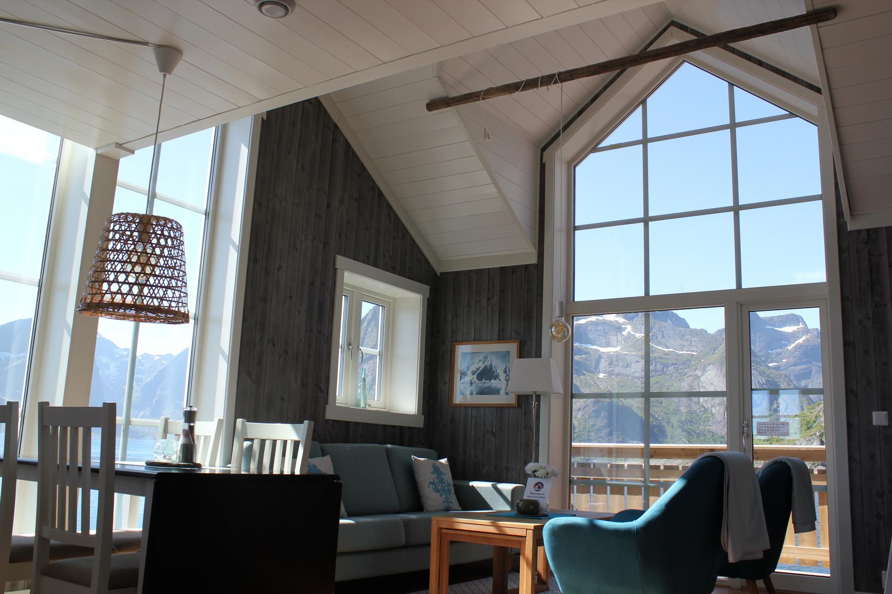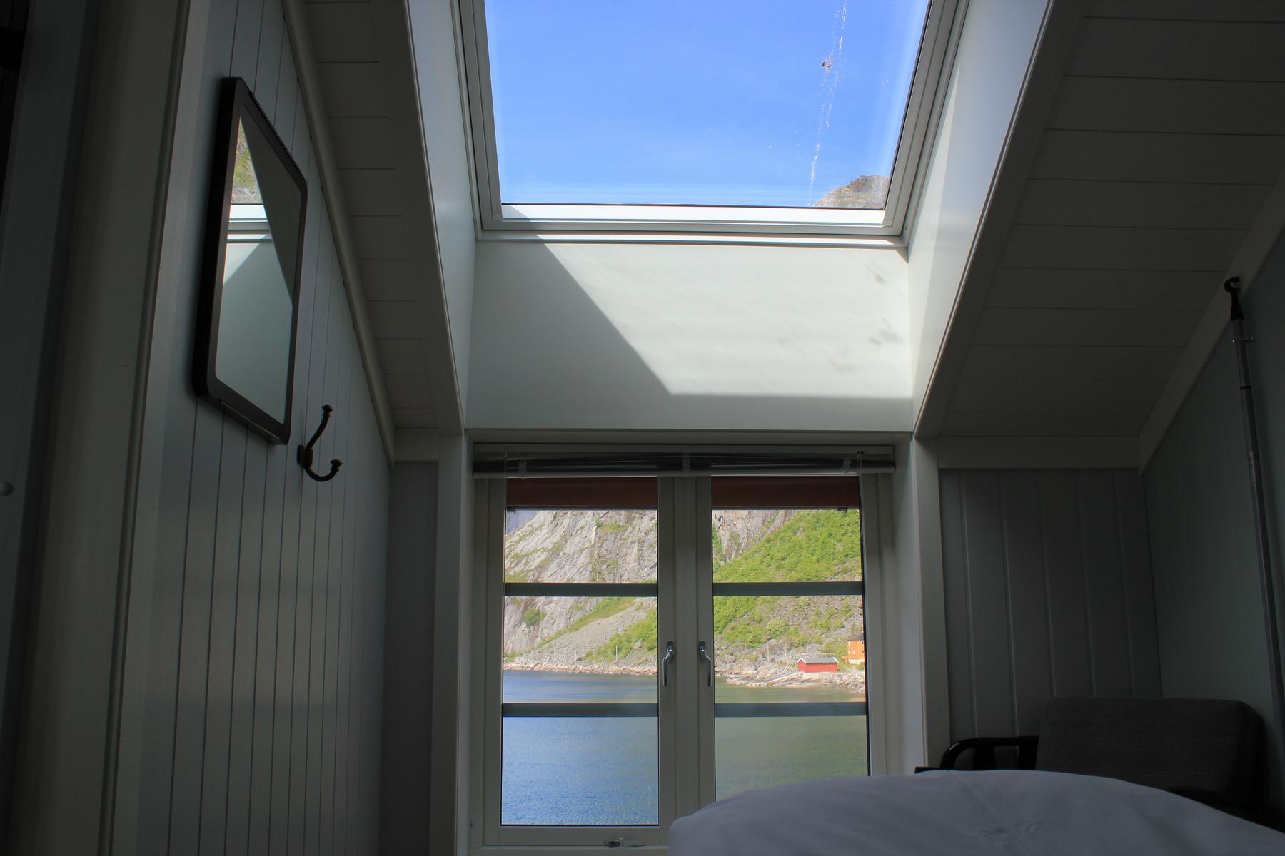 Her kan du nyte den vakre utsikten fra balkongen eller gjennom de store gulv-til-tak-vinduene. Her slipper solen, stjernehimmelen og nordlyset inn. Om vinteren kan du, hvis du er heldig, legge deg og se nordlyset gjennom takvinduet på hovedsoverommet.