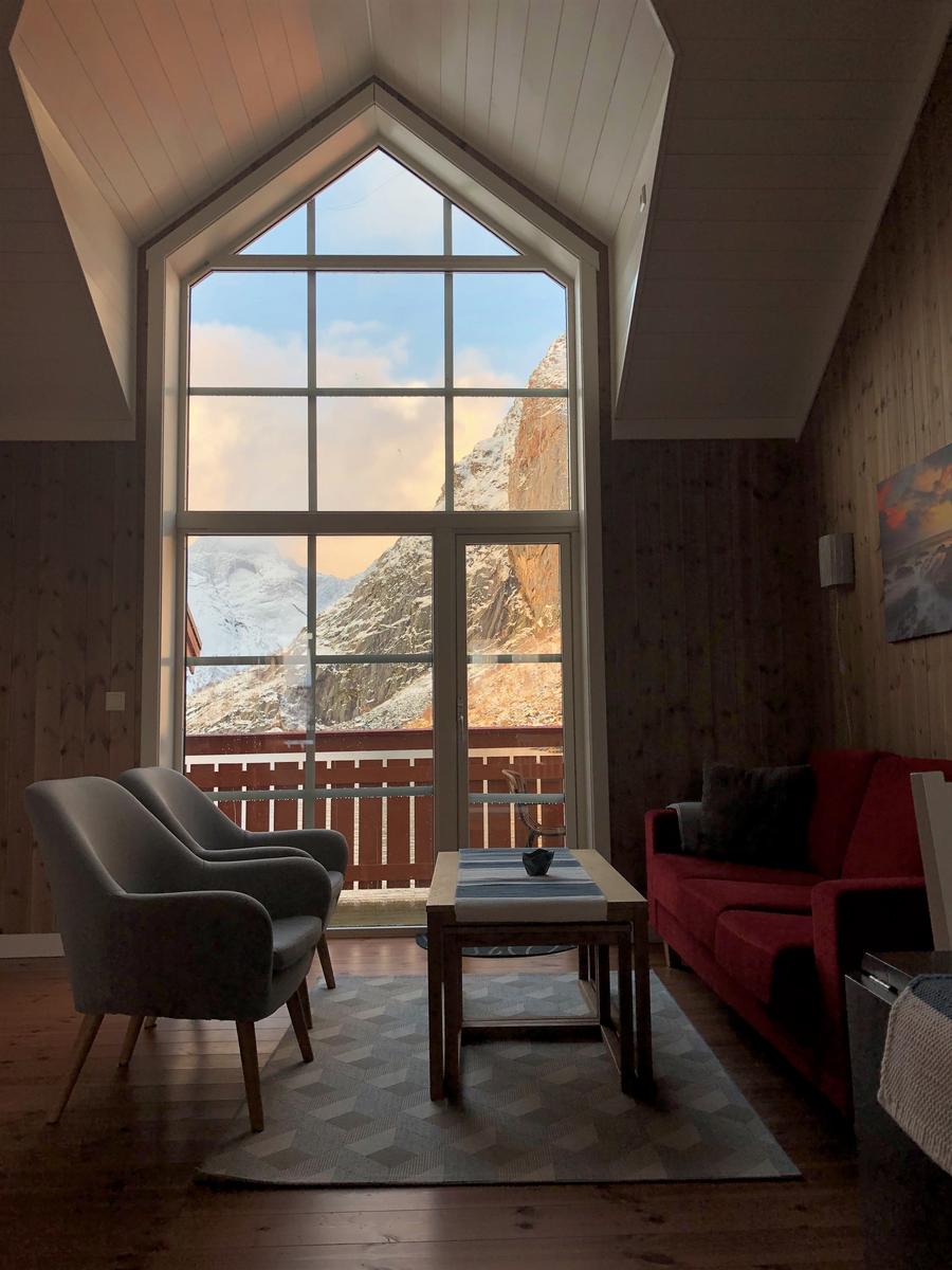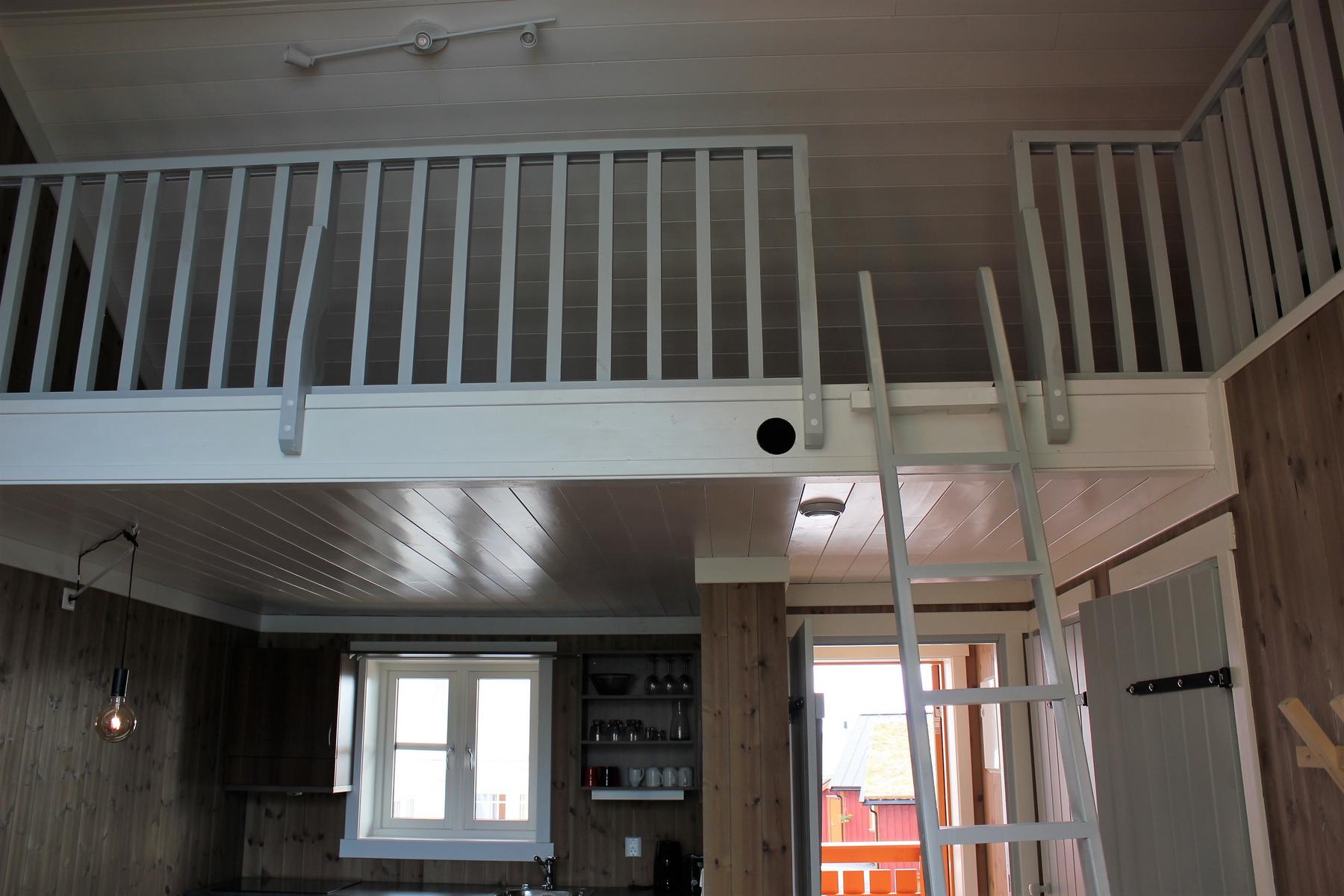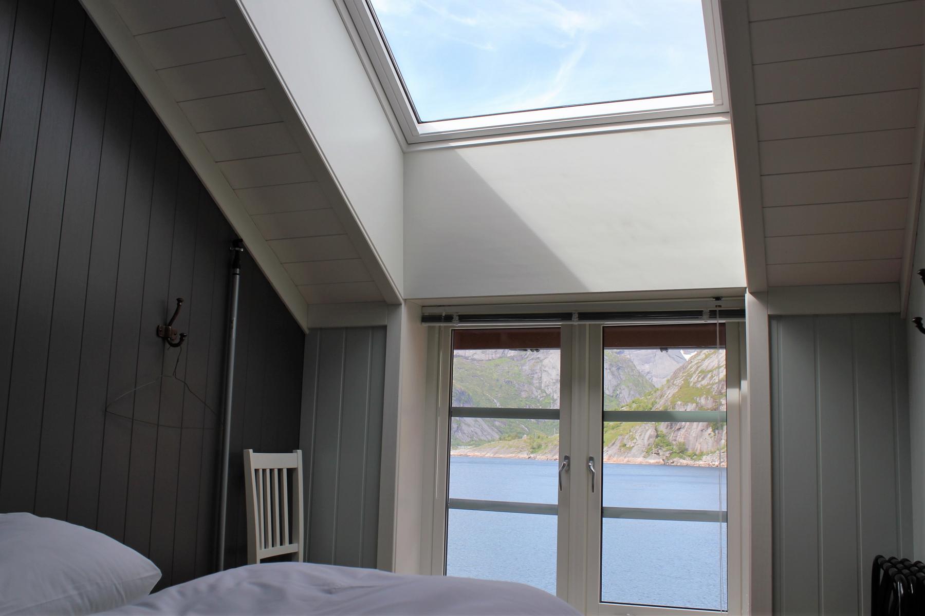 Her kan du nyte den vakre utsikten fra balkongen eller gjennom det store gulv-til-tak-vinduet. Her slipper solen, stjernehimmelen og nordlyset inn. Om vinteren kan du, hvis du er heldig, legge deg og se nordlyset gjennom takvinduet på hovedsoverommet.